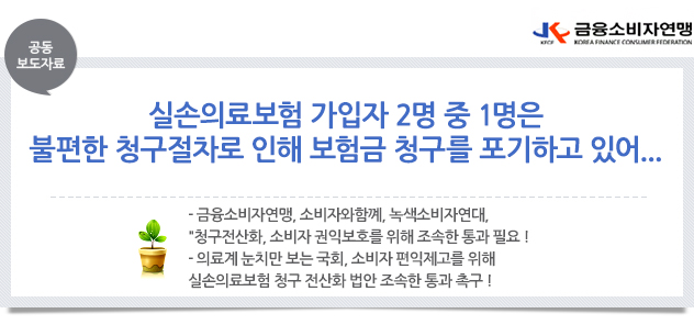 ○ 소비자단체들은 실손의료보험 청구전산화는 의료계나 보험사의 이해관계가 아니라 현재 실손의료보험에 가입한 3,900만명의 소비자 편익 증진을 위한 제도개선임을 명확하게 인식해야 할 것이라고 밝혔다. 특히 지금도 실손의료보험에 가입한 국민중 47.2%는 청구절차의 불편 때문에 청구를 포기하고 있음을 국회와 정부 당국자들은 명확히 인지해야 하며, 지난 10년간 이해당사자의 눈치만 보다가 정작 국민들의 불편을 외면해온 것을 절대 좌시하지 않을 것이라고 밝혔다.