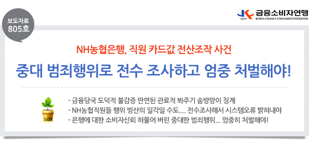 □ 금융소비자연맹(www.kfco.org, 회장 조연행, 이하 ‘금소연’)은 “NH농협은행 직원들이 자신들의 카드값을 갚은 것처럼 전산조작한 사건은 은행에 대한 소비자 신뢰를 무너뜨리고 개인의 이익을 위해 횡령한 범죄 행위로 관련자들과 농협은행에 대해 강력히 처벌해야 하며, 은행의 도덕적 불감증이 만연해 전산조작 사건이 빙산의 일각일 수 있음으로 전수조사해 시스템상 오류나 허점을 밝혀내 개선해야 할 것”이라고 밝혔다.