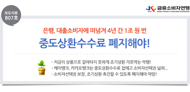 | 제목 | [보도자료 807호] 은행, 대출소비자에 떠넘겨 4년 간 1조 원 번 중도상환수수료 폐지해 | ||||