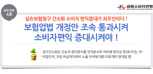 □ 한국소비자단체연합(약칭 한소연, 회장 조태임)은 “실손보험청구 간소화 문제는 소비자 편익 증대를 최우선으로 고려하여, 더 이상 의료계의 명분없는 반대의 소모적인 논쟁은 그만 두고, 조속히 보험업법 개정안을 통과시켜야 한다."고 밝혔다.