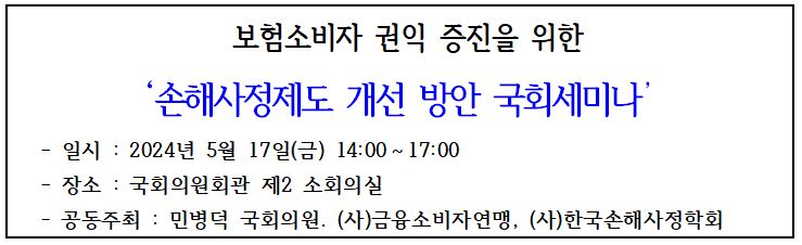 □ 금융소비자연맹(www.kfco.org, 회장 조연행)은 민병덕 국회의원, (사)한국손해사정학회와 공동으로 2024년 5월 17일 오후 2시 국회 제2 소회의실에서 2024년 8월 6일 ‘개정 보험업법’의 시행에 앞서 손해사정제도 개선 목표를 손해사정 전과정의 원칙ㆍ절차 등의 확립과 신뢰받는 보험금 지급 관행 정립에 두고, 보험소비자 권익 제고 방안을 모색하는 『손해사정제도 개선방안 국회세미나』를 개최한다.