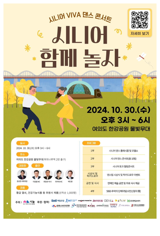 □ 금융소비자연맹(www.kfco.org, 회장 조연행, 이하 금소연)은 액티브 시니어 플랫폼 ‘시놀’의 5070 시니어를 위한 문화예술페스티벌 '시니어 함께 놀자’행사를 후원한다. 이 행사는 2024년 10월 30일 수요일 오후 3시부터 6시까지 서울 여의도 한강공원 물빛무대에서 액티브시니어협회,라이온스클럽,대한건설기계협회,한국문화예술전문협회 등 다양한 시니어 유관단체들의 후원과 참여 속에서 진행된다. 금소연은 주요 소비자 그룹으로서 자산과 구매력을 가진 ‘액티브 시니어'에 주목해 왔다.50대 이상 시니어들은 오랜 경제활동 경력을 통해 부동산과 금융자산,3층 연금(공적연금/퇴직연금/개인연금)을 보유하면서 다양한 사회적 활동과 활발한 소비를 보여주고 있다.부동산 투자와 금융 재테크로 리스크를 관리하면서 자산증식을 챙기는 세대이면서,헬스케어와 의료서비스에도 적극적으로 투자하는 등 건강관리를 하면서 역동적으로 인생 후반기를 열어가는 모습을 보여 준다. 코로나19 엔데믹이 되면서 시니어들의 커뮤니티 활동과 문화적 행사를 통한 관계십 형성과 나눔활동이 활발하다.시놀은 액티브시니어들의 커뮤니티 플랫폼으로서 ‘시니어 함께 놀자’라는 문화활동을 주최하여 시니어라이프의 혁신적인 문화콘텐츠를 만들고 있다.시선을 의식해야 하는 어르신 대접과 젊잖은 체면문화를 벗어버리고 자기 활력을 높여 건강한 시니어 커뮤니티를 만든다는 의지가 무대와 이벤트를 통해 활발하게 표현되는 기회의 마당이 열리는 것이다. 이번 행사에서는 시니어플래시몹, 시니어모델쇼, 시니어댄스콘서트, 토크힐링콘서트, 5060추억의 단체미팅 등 시니어들이 스스로 참여하는 다양한 프로그램을 통해 기존의 수동적 고령자보다 나를 활력있게 표현하는 액티브시니어들의 넘치는 열정을 연출함으로써 달라진 한국사회의 고령세대 모습을 보여줄 것으로 기대된다. 특히 ‘시니어댄스콘서트’는 전국댄스경연으로서 지역예선을 통해 창의적 안무와 역동적 장면을 다듬은 댄스팀들이 체력을 바탕으로 역동적인 끼를 발산하는 본선 무대를 연출할 것으로 예상된다.‘5060 추억의 단체미팅’도 시니어들에게 이성과 감정적 교류와 참여경험을 통해 삶의 활력을 찾고 건강하게 교류하는 계기를 만드는 추억콘텐츠로 진행될 것으로 보인다. 금소연 강형구 부회장은 “시니어 세대들이 금융투자 등 자산관리에 지혜롭고 성공적인 모습을 많이 보이는 추세인데 사회적 커뮤니티에 활발하게 참여하면서 취미,동호회 활동에서도 활력을 얻는다면 건강한 시니어 세대가 형성될 것이다”고 강조하면서 “이번 시놀의 시니어함께 놀자 행사가 시니어 생활문화콘텐츠를 새롭게 구성하는 기회가 될수 있도록 금소연도 참여자들을 대상으로 ‘보이스피싱 및 금융투자사기 예방 대처법’ 등 금융리스크 관리 홍보책자 배포와 행사참여,후원에 나설 것” 이라고 설명했다.