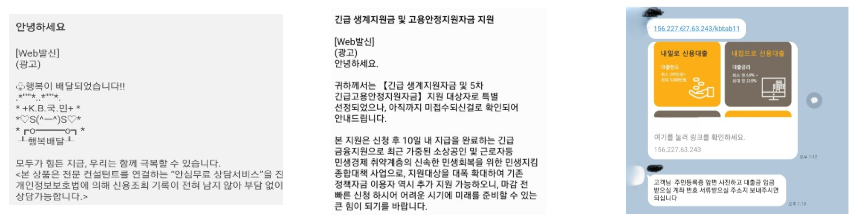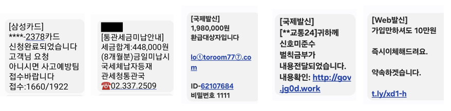 ‘카드 신청 완료, 발급, 해외사용, 해외결제완료’, ‘해외직구 구매 완료’, ‘즉시 10만 원 이체’, ‘휴대폰 고장 수리’, ‘계정위험감지 인증 완료’, ‘경조사 알림’, ‘택배ㆍ배송 안내’, ‘운송장 발송’, ‘통관세금미납안내’, ‘세금환급’, ‘과태료ㆍ벌칙금 부과 내용 확인’ 등 사기수법이 미끼문자에 의한 통화 유도에서 URL 클릭 시 원격 조성 악성 앱 휴대폰 설치, 해킹으로 진화하고 있다. 사기범이 개인정보를 탈취하여 금전을 편취하며 휴대폰 개통, 신용카드 개설 및 대출 등 2차 피해가 발생한다.