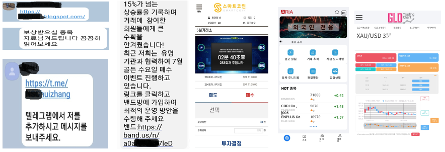 - 사기범이 입출금이 되는 피싱사이트로 유인한 후 매매를 가장하여 투자금을 편취하거나 투자금과 수배되는 헛수의 수익금 인출 조건으로 금전을 요구하고, 유명인을 사칭한 유망사업 직접투자, 사업투자설명회와 모집 수당을 지급하는 다단계투자 등 다양한 수법으로 자금을 편취한다.