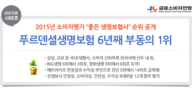 □ 금융소비자연맹(www.kfco.org, 이하 ‘금소연’)은 소비자에게 합리적인 보험 선택을 위한 개별 보험사 정보를 제공하기 위하여 2014년 12월말 현재 23개 생명보험회사의 경영공시자료를 비교 분석하여 “2015년 좋은 생명보험회사 순위”를 공개하였다. 평가 결과 1위는 푸르덴셜생명, 2위 삼성생명, 3위 ING생명이며, 푸르덴셜생명은 전년에 이어 1위를 고수함으로써 6년째 부동의 1위를 차지했다. □ 전부문 골고루 좋은 성적을 거둔 푸르덴셜생명이 1위를 차지하였고, 삼성생명과 ING생명이 2위와 3위를 차지 하였다.
