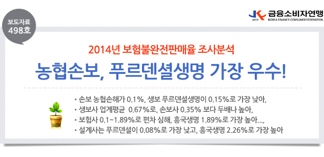 □ 금융소비자연맹(www.kfco.org, 상임대표 조연행, 이하 ‘금소연’)은 2014년 보험사 불완전판매비 율을 조사한 결과 소비자가 가입한 보험상품에 불만족하여 해지등을 한 불완전판매비율이 농협손해보험은 1 천건당 1건에 불과하였고, 푸르덴셜생명은 1천건당 1.5건에 불과해 불완전 판매비율이 가장 낮아 소비자들에 게 상품을 가장 잘 판매 하는 것으로 조사됐다고 발표하였다. 보험 불완전판매비율은 신계약 건수대비 품질보증해지, 민원해지, 무효건수의 비율로 소비자들이 보험상 품과 계약에 불만족하여 해지를 요구한 비율로 보험사간 불완전판매비율의 편차가 0.1%에서 1.89%까지 약 19배나 차이를 보이는 것은 보험사간의 계약관리시스템의 현격한 차이를 보여주는 것으로 소비자는 불완전판 매비율이 높은 보험사는 선택에 신중을 기울여야 한다고 밝혔다. □ 손해보험사의 불완전판매비율 업계평균은 0.35%이나 생명보험사는 0.67%로 손해보험사보다 약 2배나 높은 것으로 나타났으며, 판매채널로 보면 설계사는 손보사가 평균 0.25%이나 생보사는 0.59%로 손보사보다 약2.4배나 높았고, 개인대리점도 손보사가 0.17%이나 생보사는 0.72%로 손보사보다 약4.2배 나 높았다.