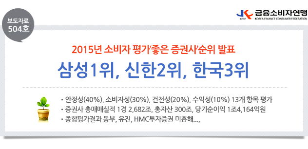 | 제목 | [보도자료 504호] 2015년 소비자 평가‘좋은 증권사’순위 발표 | ||||