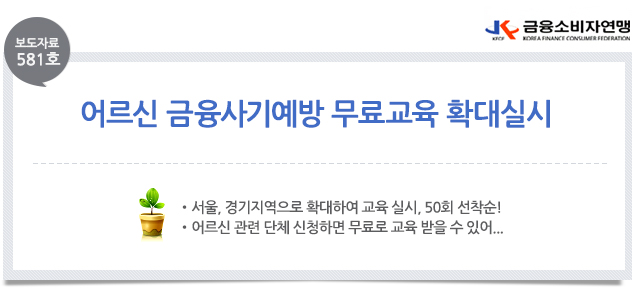 □ 금융소비자연맹(www.kfco.org, 이하 ‘금소연’, 상임대표 조연행 )은 라이나전성기재단의 지원사업으로 2016년 “어르신 금융사기 예방교육 ”을 11월까지 50회 무료 교육을 실시하고 있다며, 지역을 서울,경기로 확대하여 실시한다며 많은 참여를 바란다고 말했다. 어르신들을 상대로 하는 금융사기가 늘고 수법도 교묘하게 진화하고 있어, 어르신들의 금융에 대한 이해를 돕고 금융사기의 유형과 피해예방법을 미리 알려 드림으로써 어르신들의 금융사기 피해를 줄이기 위함이다. □ 금융은 일상생활에 밀접하나, 어르신들은 제대로 된 금융교육을 받기 어렵고 금융이 전문적이고 복잡해 알기 어려워 금융 정보에 어두워 보이스피싱, 파밍 등의 사기에 취약하고, 그나마 알았다고 해도 계속 사기수법이 다양하게 진화하고 있어 속수무책으로 당하는 경우가 많다. □ 금감원이 분류한 전기통신금융사기 피해구제신청 건수는 60세 이상 비중 (2015년1- 8월)은 피싱(전화금융사기) 사건의 경우 16.8%를 차지했으며, 경찰청 자료 따르면 60세 이상 노인을 상대로 한 사기범죄 건수는 2011년 1만306건 에서 2014년 2만 2700건으로 불과 3년 만에 2배 이상 증가했고, 작년8월에는 금융감독원이 노인 상대 금융사기주의보를 발령하기까지 했다.