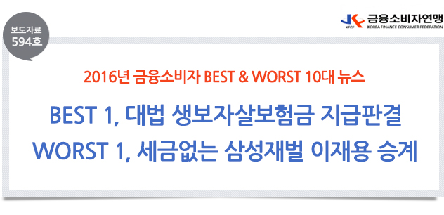 □ 금융소비자연맹(www.kfco.org, 상임대표 조연행, 이하 금소연)은 2016년 한 해 동안 소비자에게 가장 큰 영향을 준 BEST 뉴스 5개와 WORST 뉴스 5개를 “금융소비자 10대 뉴스”로 선정 발표했다. 올해 최선의 뉴스로는 생보사 부당성에 제동을 건“대법의 생보자살보험금 지급 판결”이 선정되었고, 최악의 뉴스로는 소비자 불만이 증폭된“세금 없는 삼성재벌 이재용 승계”를 선정 발표 했다. <2016년 금융소비자 10대 뉴스>