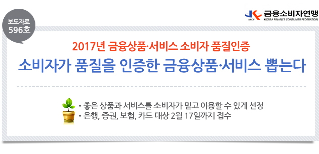 □ 금융소비자연맹(www.kfco.org, 상임대표 조연행, 이하 금소연)은 소비자가 안심하고 금융상품을 구매하고 서비스를 이용할 수 있도록 하기 위한, 2017년 금융상품과 서비스에 대해 ‘소비자품질인증’ 을 공모 한다고 밝혔다. □ "소비자품질인증"은 금융사에서 판매하는 금융상품과 서비스 중 상품의 품질이 우수하여, 소비자가 안심하고 선택할 수 있고, 믿고 서비스를 이용할 수 있는 금융상품과 서비스를 소비자단체가 품질을 인증하는 것으로 매년 공모하여 선정해왔다. □ 금융상품과 서비스에 대한 품질인증은 은행, 증권, 보험, 카드 등 금융회사가 판매하고 있는 모든 상품과 서비스를 대상으로 하며, 금융, 소비자학 교수, 유관단체, 감독당국, 소비자대표 등으로 구성된 심사위원회가 신청 접수된 상품과 서비스에 대해 ‘소비자성(30%), 실효성(30%), 신뢰성(20%), 창의성(20%)을 평가하여 품질이 우수(80점 이상)하다고 판정한 금융상품과 서비스에 대해 품질인증서와 인증마크를 부여함.