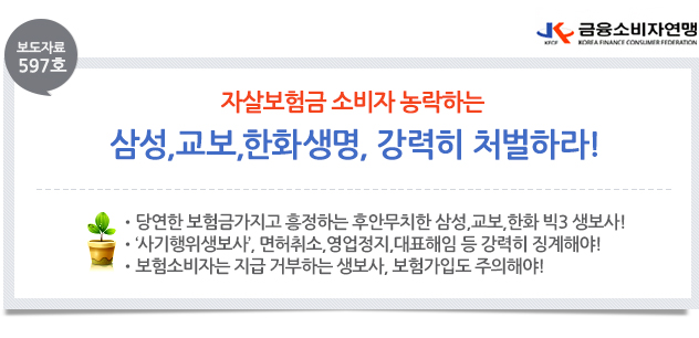 □ 금융소비자연맹(www.kfco.org, 상임대표 조연행, 이하 ‘금소연’)은 생명보험사가 2년이 지난 자살에 대해 소비자를 속이고 재해사망보험금이 아닌 보험금이 적은‘일반사망보험금’을 지급해 온 자살보험금 미지급 사건은 생보사의 명백한 사기 사건으로, 소비자를 농락하고 사회적 물의까지 일으킨 전무후무한 도덕적 해이 사건이다. 금감원의 적발후 11개 생명보험사는 모두 지급하겠다고 했으나, 삼성생명, 교보생명, 한화생명은 끝까지 버티며 일부만 지급하거나, 쌩뚱맞게 ‘사회공헌기금’을 만들겠다고 ‘흥정’하는 것은 소비자를 두 번 우롱하는 것으로 금융당국은 예정대로 영업권 반납, 영업정지, CEO해임 등 강력한 중징계를 반드시 내려야 한다고 밝혔다. □ 대법원의 판결로도 생명보험사가 당연히 지급해야하는 보험금을 지급하지 않는 후안무치한 행동에 경종을 울렸고, 이에 7개 생보사(ING,신한,메트라이프,PCA,흥국,DGB,하나생명)는 소멸시효 대법원 판결이전에 자발적으로 지급했고 금융당국이 나머지 생보사에 대해 소멸시효와 상관없이 지급하라는 명령에 4개 생보사(알리안츠,동부,현대라이프,KDB생명)가 지급을 결정했으나 대형 생보사인 삼성생명,교보생명,한화생명은 끝까지 버티기로 일관하고 있다. 교생명명은 전체 미지급액 1,143억원중 167억원인 약 14.6%만 지급하겠다고 했고, 한화생명도 미지급액 1,050억원 중 약 15%만 지급을 검토하고 있고, 삼성생명은 미지급액 중 약 25%를 보험금을 지급하는 것이 아닌 자살예방재단에 기탁하겠다고 알려졌다.