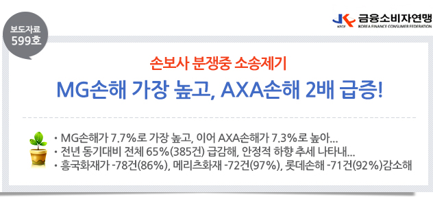 | 제목 | [보도자료 599호] 손보사 분쟁중 소송제기 MG손해 가장 높고, AXA손해 2배 급증! | ||||