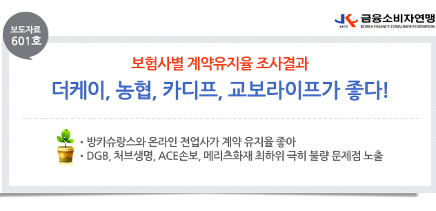 | 제목 | [보도자료 601호]보험계약유지율 더케이,농협,카디프,교보라이프가 좋다! | ||||
