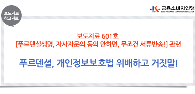 □ 푸르덴셜생명은 금융소비자연맹(www.kfco.org, 이하 ‘금소연’, 상임대표 조연행)이 보도자료 601호를 통해 “푸르덴셜생명이 소비자가 보험금 청구시 반드시 자사 의료자문 의사의 조사에 동의하지 않으면, 무조건 보험금 청구서류를 일방적으로 반송 처리하는 횡포를 부린다”는 보도자료에 대해 사실과 다르다고 주장하므로 이에 대해 보도참고자료를 배포합니다. 푸르덴셜생명은 소비자가 제3병원이나 동시 감정을 요구해도, 자사 자문의가 누구인지도 밝히지 않으면서 자사자문의에게 정보제공을 동의하지 않았음을 이유로 보험금 처구서류를 무조건 반송하는 횡포를 부리고 있었습니다. □ 개인정보보호법 제17조 ②항1 에는 분명히 개인정보를 제공받는 자를 정보주체에게 알리도록 명시하고 있습니다. 그럼에도 푸르덴셜은 보험금을 청구한 정보주체에게 “어느 의사 누구에게 ”제공할 것인지 알려주지도 않고 무조건 서명동의를 요구하였습니다.