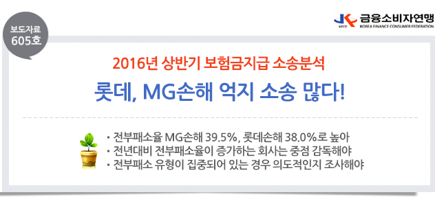 □ 금융소비자연맹(www.kfco.org, 이하 ‘금소연’, 상임대표 조연행 )은 손해보험사 2016년 상반기 보험금청구,지급관련 소송현황을 분석한 결과 보험사가 소송을 제기(원고)하여 선고 결과(선고외 제외), 전부승소율이 79.9%, 전부패소율은 12.5%로 보험사 승소율이 높은 것으로 나타났다고 밝혔다. 반면, 롯데손해는 50.6%로 가장 낮은 승소율을 나타냈고 이어 MG손해가 57.9%의 낮은 승소율 나타내, 이들 보험사들은 보험금을 안주기 위해 무리하게 소송을 하거나 압박하기 위한 수단으로 이용했다고 볼 수 밖 없는 것으로 문제가 있다고 말했다. □ 손해보험사가 보험금청구 지급과 관련해 소송을 제기하여 선고 결과를 보면 업계평균은 79.9%로 전부승소율은 삼성화재가 100%로 가장 높았고 이어 메리츠화재가 92.3%로 높았다. 반면 롯데손해는 50.6%로 가장 낮았고 이어 MG손해가 57.9%로 낮은 것으로 나타났다. 보험사들은 막강한 자본력과 정보력으로 소비자가 보험금을 청구하면 소송을 제기해 금융감독원 민원통계와 분쟁조정 대상에서도 제외시키고, 어려움에 빠진 소비자를 법정에 세워 소송을 통해 보험금 지급 협상에 유리한 위치에 서기 위해 소송을 남발하는 경우가 많다.