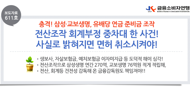 | 제목 | [보도자료 611호] 삼성교보, 이차배당금 전산조작 회계부정 면허취소해야! | ||||