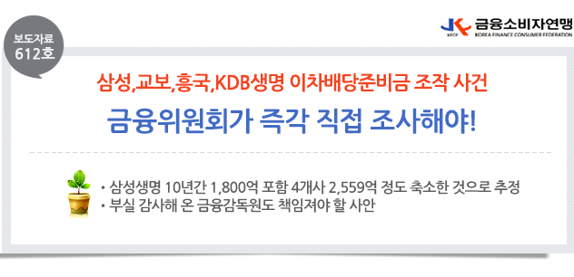 금융소비자연맹(www.kfco.org, 상임대표 조연행, 이하 ‘금소연’)은 삼성,교보,흥국,KDB생명이 저질러온 ‘이차배당준비금 조작사건’전산을 조작하여 배당금 산출과정을 모르는 소비자를 속여 2,500억원 이상의 이차배당준비금 적립을 줄여온 중차대 한‘회계부정’사건으로 금융위원회(임종룡 위원장)는 즉각적으로 직접 조사해야 할 것이라고 밝혔다. 삼성생명은 매년 200억 이상을 전산조작으로 이차배당금을 축소 적립해 10년간 1,800억원 정도를 축소적립해온 것으로 추정되고, 교보생명은 624억, 흥국은 81억, KDB는 49억원의 이차배당금을 축소 적립해 이들 4개사가 총 2,559억원정도의 이차배당금을 축소해 분식 회계를 하는 회계부정을 저질러 온 것으로 추정된다. 6개 생보사중 한화생명과 알리안츠생명이 제외된 것은 이들 회사는 부실로 매각작업을 거쳤기 때문에 준비금정산 작업을 거쳐 제외된 것으로 예상된다.