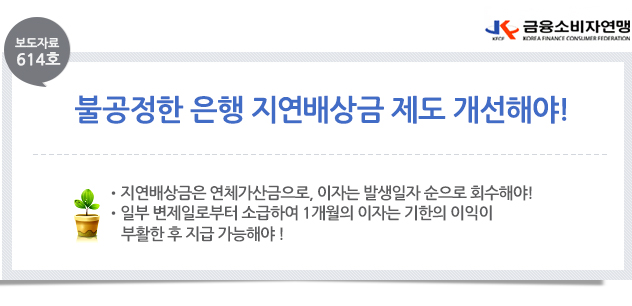 | 제목 | [보도자료 614호] 불공정한 은행 지연배상금제도 개선해야! | ||||