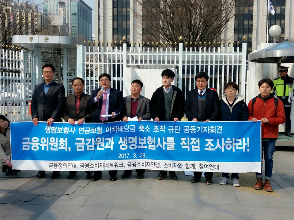 금융소비자연맹, 금융정의연대, 금융소비자네트워크, 소비자와 함께, 참여연대 경제금융센터 등 5개 단체는 오늘 오전 10시30분 금융위원회(위원장 임종룡)가 있는 광화문 정부종합청사 앞에서 많은 언론이 참석한 가운데“생명보험사 연금보험 이차배당준비금 축소조작 회계부정사건 실태조사 촉구 및 규탄”공동 기자회견을 개최하였다. 이번 사건은 생보사들이 “자살보험금 미지급”사건이 끝나기도 전에 소비자를 기만한 중차대한 회계부정사건으로 규정하고, 이 사건을 2010년부터 알고도 묵인한 금융감독원이 조사에 착수조차 하지 않고 있기에, 금융위원회가 즉각적으로 직접 조사하여 실체를 밝히고 엄중 문책과 처벌할 것을 주문하였다. 이번 공동기자회견은 금융소비자연맹의 조연행 대표가 기자회견 취지를 발표했으며, 이기욱 사무처장은 회계부정사건 경과보고 발표했다. 법률사무소 힐링 조정환 변호사는 회계부정사건의 법률적 문제점에 대해 상세히 발표했으며 안진걸 참여연대 공동사무처장의 성명서 낭독, 그리고 끝으로 금융정의연대 김득의 대표의 구호제창으로 기자회견을 마쳤다. 5개 시민 소비자단체는 이번 생명보험사 회계부정 사건은 전산을 조작해 분식회계를 한 중차대한 사건으로 소비자의 신뢰를 져버린 것은 물론 생명보험업 자체를 위태롭게 빠트린 중차대한 모럴해저드 행위로 진상을 조속히 밝혀 ‘면허취소’등 엄벌에 처해야 할 것 사건이다.