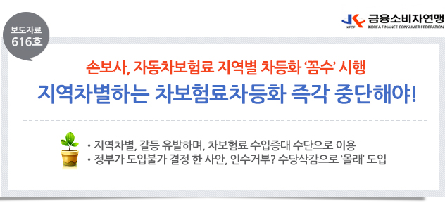 | 제목 | [보도자료 616호] 차보험 지역차별화 즉각 중단해야! | ||||