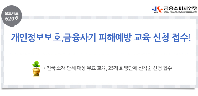 □ 금융소비자연맹(www.kfco.org, 이하 ‘금소연’, 상임대표 조연행 )은 행정자치부의 지원으로 ‘개인정보 보호 및 금융사기 피해 예방 교육’을, 6월부터 연말까지 실시하며, 전국 희망 단체 대상으로 선착순 접수하고 있다며 많은 신청 바란다고 밝혔다. □ 금융회사들이 개인정보의 보호를 강화하고, 금융소비자들의 개인정보에 대한 인식 제고에도 불구하고 지난해 보이스피싱 피해액이 1,919억원 발생했다. 이런 금융사기를 피해를 예방하기 위해서는 무심코 버리거나 흘린 개인정보는 범죄의 표적이 되며 내 개인정보를 지키는 것은 ‘내 재산과 나를 지키는 첫걸음이다’ 는 인식 확산이 필요하다. 따라서 청소년, 사회 초년생, 주부, 어르신 등에게 “내 정보는 내가 지킨다”는 개인정보의 중요성 인식 확산 및 금융사기 인지, 식별 및 대처 능력 등 금융 역량을 제고하기 위해 ‘개인정보보호와 금융사기 피해 예방 교육’을 무료로 실시한다. □ 교육 참여 신청은 고교생, 대학생, 직장인, 상인. 주부, 어르신 등 소속 전국의 어느 단체에서나 가능하며 교육을 요청하면 일정 협의 후 해당 일에 전문 강사가 파견하여 교육을 실시한다.