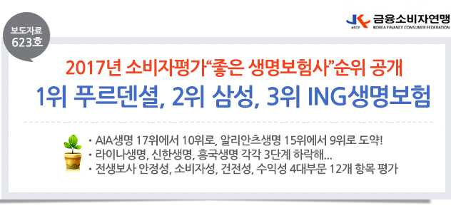 | 제목 | [보도자료 623호] 2017년 소비자평가 "좋은생보사" 순위발표 | ||||