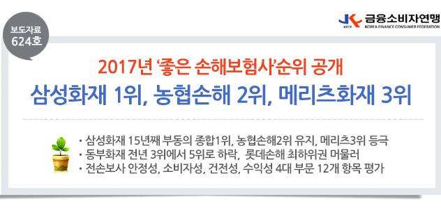 □ 금융소비자연맹(www.kfco.org,이하 ‘금소연’)은 소비자에게 합리적인 보험 선택을 위한 개별 보험사 정보를 제공하기 위하여 2016년 12월말 현재 14개 손해보험회사의 경영공시자료를 비교 분석하여 “2017년 좋은 손해보험회사 순위”를 공개했다. 평가 결과 1위는 삼성화재, 2위 농협손해, 3위 메리츠화재이며, 삼성화재는 15년째 부동의 1위를 차지하고 있으며, 농협손해는 전년에 이어 2위를 유지했고 메리츠화재는 전년 4위에서 3위로 올라섰으며, 동부화재는 5위로 뒤쳐졌다. 전 부문에서 하위로 평가된 MG손해, 롯데손해가 최하위권에 머물렀다. □ 안정성 1위와 전부문 골고루 좋은 성적을 거둔 삼성화재가 1위를 차지했고, 소비자성은 KB손해가 건전성은 ACE손해, 수익성은 동부화재가 각각 1위를 차지했다. A,B,C,D,E 5등급으로 나누면, 90점이상인 A등급은 없고, B등급은 유일하게 삼성화재가 차지했다. C등급은 농협손해, 메리츠화재, 현대해상, 동부화재, ACE손해, KB손해, AIG손해, AXA손해, 더케이손해가 차지했고, 하위 등급인 D등급은 한화손해, 흥국화재가 기록했다. E등급은 MG손해, 롯데손해가 가장 낮은 등급으로 평가댔다.