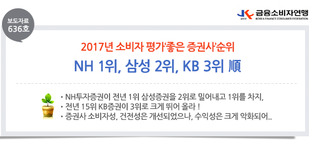 □ (사)금융소비자연맹(www.kfco.org, 상임대표 조연행, 이하 ‘금소연’)은 금융소비자에게 유익한 증권회사 선택 정보를 제공하기 위하여, 국내 20개 증권사의 개별 자료를 종합 분석하여 소비자 평가 ‘2017년 좋은 증권사’ 순위를 발표했다. 평가결과 NH투자증권이 1위를 차지하였고, 삼성증권이 2위, KB증권이 3위를 차지하였다. 평가 순위는 안정성(40%), 소비자성(30%), 건전성(20%), 수익성(10%)등 4대부문 13개 항목으로 평가해 선정했다. □ NH투자증권은 안정성 등 골고루 좋은 평가를 받아 종합 1위를 하였고, 삼성증권은 소비자성 1위이나 안정성에서 순위가 밀려 1위를 내주었다. KB증권은 현대증권을 인수 합병하여 낮은 순위의 수익성에도 다른 평가부문에서 좋은 평가를 받아 종합 3위를 한 반면, 유진투자증권, 유안타증권, 한화투자가 하위권을 차지했다. ※ 붙임자료 : 1. 2017년 금융소비자 평가 "좋은 증권사 순위" 결과 1부.