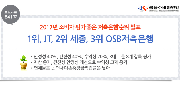 □ 금융소비자연맹(www.kfco.org, 이하 ‘금소연’)은 금융소비자에게 유익한 금융사 선택 정보를 제공하기 위하여, 자산이 5,000억 원 이상인 33개 저축은행의 공시자료를 종합 분석하여 소비자 평가 ‘저축은행’ 순위를 공개 발표하였다. JT저축은행이 1위를 차지하였다. □ 금융소비자연맹(www.kfco.org, 이하 ‘금소연’)은 금융소비자에게 유익한 금융사 선택 정보를 제공하기 위하여, 자산이 5,000억 원 이상인 33개 저축은행의 공시자료를 종합 분석하여 소비자 평가 ‘저축은행’ 순위를 공개 발표하였다. JT저축은행이 1위를 차지하였다. □ JT저축은행이 종합평가 1위를 차지하였고, 2위는 세종저축은행, 3위는 OSB저축은행이 차지하였다. JT저축은행은 수익성 22위로 낮으나 건전성 2위, 안정성 6위로 좋은 평가를 받아 1위를 하였고, 세종저축은행은 수익성 2위, 건전성 9위, 안정성 12위 등 고루 좋은 평가를 받아 2위를 차지하였다. OSB저축은행은 수익성 18위, 안정성 29위임에도 건전성 1위로 3위를 하였으며, 은행계 저축은행으로는 IBK저축은행이 가장 좋은 5위를 하였다. ※ 붙임자료 : 1. 2017년 금융소비자 평가 "좋은 저축은행 순위" 결과 1부.