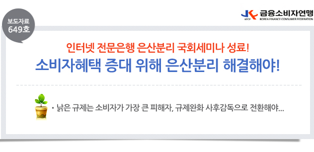 | 제목 | [보도자료 649호] 인터넷은행 은산분리문제, 소비자혜택 위해서 해결해야! | ||||