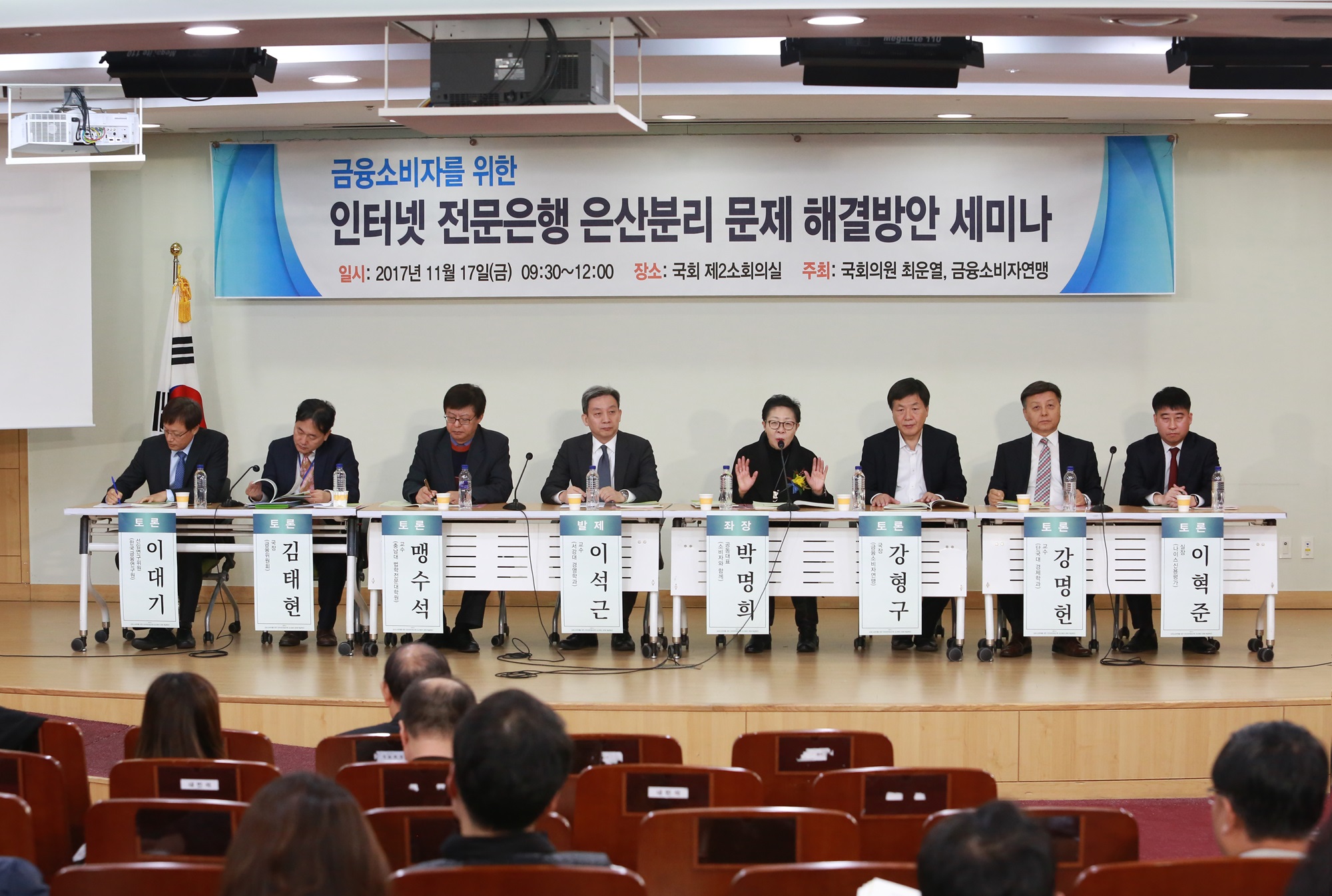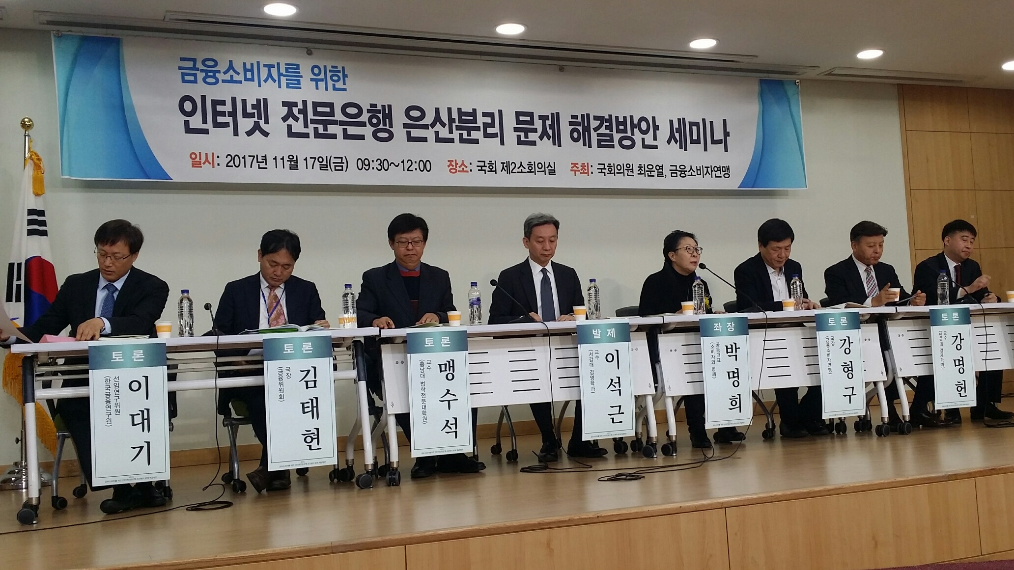 □ (사)금융소비자연맹(www.kfco.org, 상임대표 조연행, 이하 ‘금소연’)은 최운열 국회의원과 11월 17일(금) 오전 10시부터 국회에서 ‘금융소비자를 위한 인터넷 전문은행 은산분리 문제 해결방안’을 주제로 성황리에 세미나를 마쳤다고 밝혔다. 이날 세미나는 이석근 교수(서강대 경영학과)가 발제를 맡았고, 패널토론은 맹수석 교수(충남대 법학전문대학원), 강명헌 교수(단국대 경제학과), 이대기 선임연구위원(한국금융연구원), 이혁준 실장(나이스신용평가), 강형구 금융국장(금융소비자연맹), 김태현 금융서비스국장(금융위원회)이 토론자로 나섯으며, 박명희 (사)소비자와 함께 대표가 사회를 맡았다. □ 세미나 주최자인 최운열 국회의원은 “1984년 도입된 은산분리 규제는 시대에 맞게 개선하지 못해, 사금고화가 불가능한 인터넷은행의 정상적인 투자와 영업까지 가로막고 있는 셈“이라며,“낙후된 은행산업에 새로운 경쟁과 혁신을 불러 일으키기 위해서는 은산분리 규제에 대한 재검토가 필요하다.”고 말했다. 금융소비자연맹 조연행 상임대표는 인사말에서 “소비자 후생을 증대시키고, 은행들의 경쟁력을 키우기 위해서는 인터넷전문은행이 메기역할을 해줘야 하는데, 은산분리문제가 발목 잡는 형국” 이라며, “은산분리 원칙을 지키며, 메기은행을 키울 수 있는 묘방이 필요하다”고 말했다.