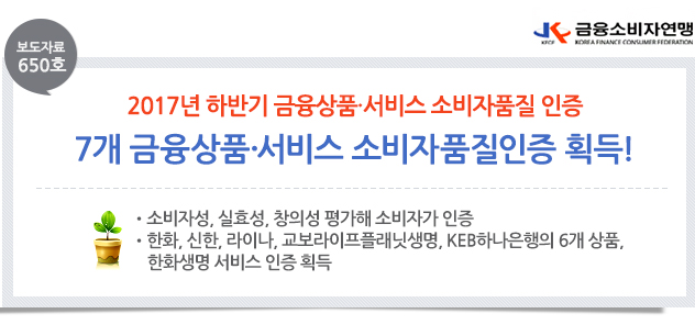 □ 금융소비자연맹(www.kfco.org, 상임대표 조연행, 이하 금소연)은 소비자가 안심하고 금융상품을 구매하고 서비스를 이용할 수 있도록 하기 위해, 2017년 하반기 ‘금융상품·서비스 소비자품질 인증’ 을 실시한 결과 6개의 금융 상품과 1개 서비스가 선정됐다고 발표했다. □ 2017년 하반기 금융상품서비스 품질인증을 받은 6개 금융상품과 1개의 서비스는 다음과 같다. 한화생명의 (무)한화생명 '내가 찾던 건강종신보험'은 업계 최초로 경증 질병부터 사망에 이르기 까지 체계적인 3단계 진단자금을 보장한다는 점,