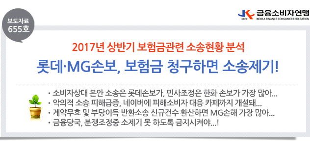 | 제목 | [보도자료 655호] 롯데,MG손보, 보험금 청구하면 소송제기 가장 많다! | ||||