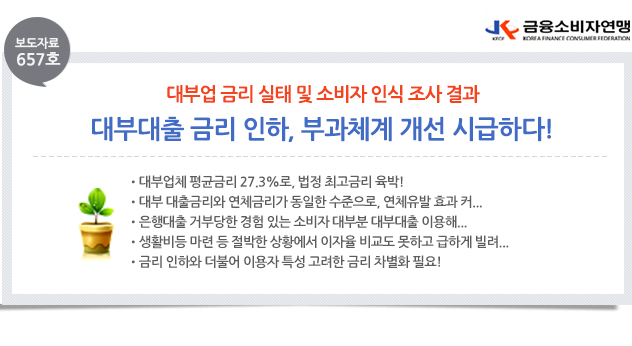 | 제목 | [보도자료 657호] 대부업금리 너무 높고, 부과체계도 비합리적! | ||||