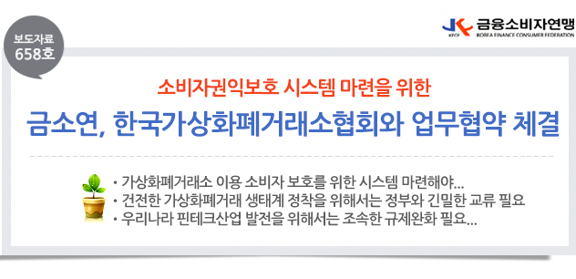 □ 금융소비자연맹(회장 조연행)이 9일 센터포인트빌딩에서 한국가상화폐거래소협회와 업무협약을 체결했다. 협회와 금소연은 가상화폐거래소를 이용하는 소비자 보호를 위한 행동과 방안을 제시하고, 건전한 가상화폐거래 생태계 정착을 위해 협력하기로 했다. □ (가칭)한국가상화폐거래소협회와 금융소비자연맹은 가상화폐 거래의 잘못된 풍토의 건전한 방향 제시, 투자자들에게 잘못된 정보에 대한 오류 수정, 건전한 가상화폐거래 생태계 정착을 위한 정부와의 교류 등을 내용으로 하며 이서령 추진위원장과 조연행 회장이 협약서에 서명하였다. 오전 10시에 진행된 체결식에는 이서령 한국가상화폐거래소협회 추진위원장, 김정우 미래에셋대우 차세대추진단 상무보, 이철이 Bitor Group 대표이사가 참석했으며 금소연에서는 조연행 회장, 조정환 자문변호사와 송대길 대외협력위원이 참석했다.