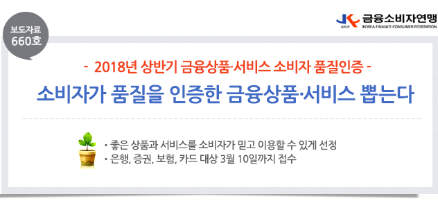 | 제목 | [보도자료 660호] 2018년 소비자 품질인증 금융상품서비스 뽑는다! | ||||