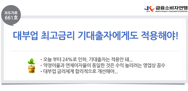 □ 금융소비자연맹(www.kfco.org, 상임대표 조연행, 이하 ‘금소연’)은 오늘부터 법정최고금리가 24%로 인하됨에 따라 서민들의 대부업체 이용 이자부담이 줄어들겠지만, 기존 대출자는 적용이 배제되어 반쪽짜리 시행으로 전부 적용해야 마땅하고, 정상금리와 연체금리를 동일하게 적용하는 등 대부업체의 불합리적 불공정한 금리체계를 합리적으로 개선하여 서민들이 부담을 완화시켜야 할 것이라고 밝혔다. □ 법정 최고금리(24%) 적용 규정은 금융소비자에게 유리한 강행규정으로 기존 대출자에 대해서도 시행일 이후부터 발생하는 이자에 대하여 변경된 최고금리를 적용하여야 마땅하나, 그렇게 적용하지 아니하도록 법을 잘못 제정하였다. 최고금리가 인하되어도 기존 대부이용자는 재대출을 하지 않는 한 혜택을 보지 못하므로, 시행령의 부칙에 의해 시행령 시행 이후에 계약을 체결 또는 갱신하거나 연장하는 분부터 적용되고 기존 계약에 대하여는 기존 계약상의 금리가 적용되기 때문이다.