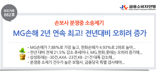 | 제목 | [보도자료 662호] MG손보 2년연속 최고!, 2017손보사 분쟁중 소송제기율 | ||||