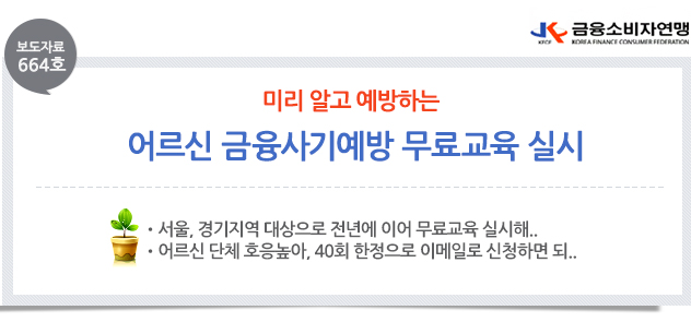 | 제목 | [보도자료 664호] 어르신 금융피해예방 무료교육 실시! | ||||