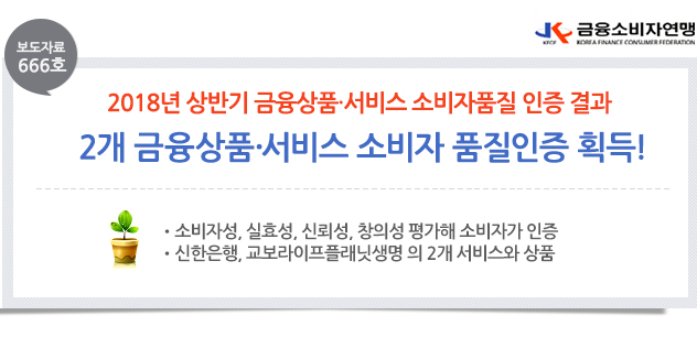 | 제목 | [보도자료 666호] 2018년 상반기 금융상품·서비스 소비자품질 인증 결과 | ||||
