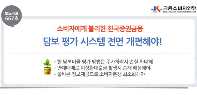 | 제목 | [보도자료 667호] 소비자에게 불리한 한국증권금융 담보 평가 시스템 전면 개편해야! | ||||