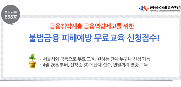 | 제목 | [보도자료 668호] 금융취약계층 금융역량제고를 위한 불법금융 피해예방 무료교육 신청접수 | ||||