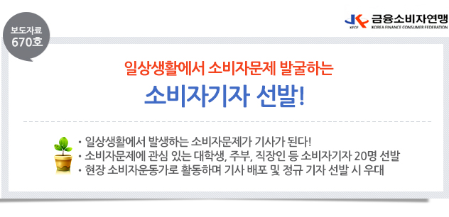 □ (사)금융소비자연맹(www.kfco.org, 회장 조연행, 이하 ‘금소연’)과 소비자권리찾기시민연대(대표 이은영), 소비라이프(대표 조정환)는 일상생활에서 발생하는 소비자문제를 폭넓고 다양하게 수집하고 취재하여 이를 소비자정보로 널리 전파하고자 생활 현장의 소비자기자 20명을 5월31일까지 선발한다고 밝혔다. □ 소비자기자는 소비자문제에 관심 있는 대학생과 주부, 직장인 등 누구나 지원가능하며, 일상생활에서 발생하는 “소비자에게 유익한 정보, 일상생활 현장에서 일어나는 소비자 피해 및 민원, 소비자불편사례, 소비자가 꼭 알아야 할 상식” 등 소비자가 알아둘 만한 좋은 소식을 폭넓고 다양하게 수집·취재하여 이를 소비자뉴스로 제공하게 된다. □ 이번에 선발하는 20명의 소비자기자는 자신의 관심분야에서 발생하는 소비자문제를 수집·취재·평가·분석 후 기사로 작성하여 인터넷 신문 ‘소비라이프’에 기자 실명으로 게재할 수 있다. 기자에게는 원고료와 기자활동증명서, 수료증이 수여되며, 정규 기자 채용 시 우대 선발 혜택이 주어진다.