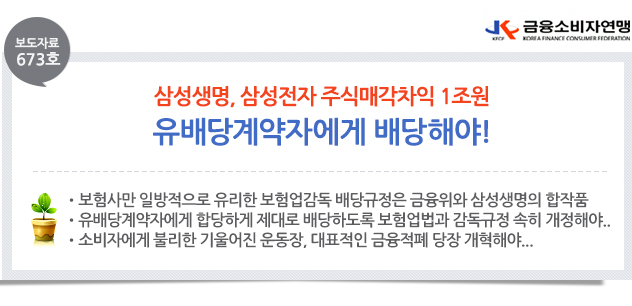 | 제목 | [보도자료 673호] 삼성생명,삼성전자매각차익1조원 유배당계약자에게 배당해야! | ||||