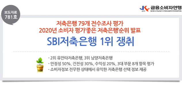 *2020년 금융정보통계시스템에 정보를 공개한 79개 저축은행 결산 조사결과 (금융감독원 공시자료) □ 금융소비자연맹 강형구 사무처장은 “금융소비자들이 신뢰할 수 있을 만큼 저축은행이 튼튼해졌으나 안정성, 건전성, 수익성의 순위 변동이 커 금융소비자연맹이 공시자료를 취합하여 생성·제공하는 정보가 저축은행을 선택할 때 유익한 길잡이 역활을 할 수 있기를 기대한다.”라고 말했다. ※ 붙임자료 : 1. 2020년 금융소비자 평가 "좋은 저축은행 순위" 결과 1부. 2. 2020년 저축은행 금융소비자 평가 순위 결과표 1부
