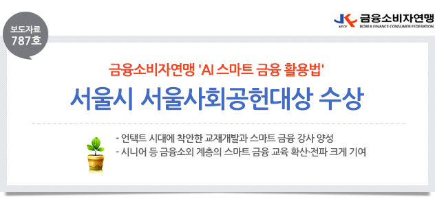 | 제목 | [보도자료 787호] 금융소비자연맹 'AI 스마트 금융 활용법' 서울시 서울사회공헌대상 | ||||