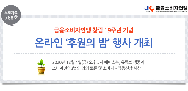 □ 금융소비자연맹(www.kfco.org, 대표 조연행, 이하 '금소연')은 코로나19의 언택트 시대에 부응하고자, 창립 19주년 기념 후원의 밤 행사를 온라인 비대면 행사로 오는 12월 4일 오후 5시부터 6시까지 1시간 동안 금융소비자연맹 페이스북과 유튜브 계정으로 생방송 진행된다.