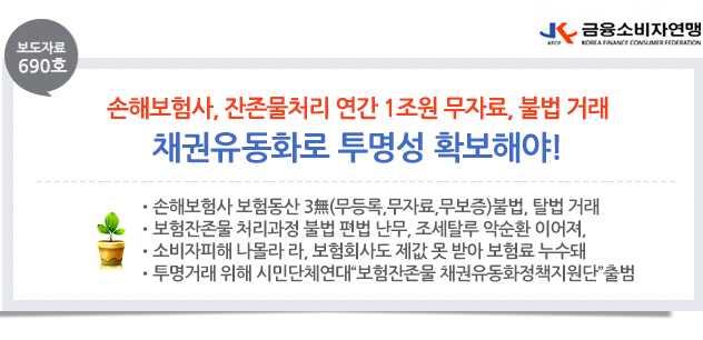 □ 금융소비자연맹(회장 조연행, 이하 ‘금소연’ )은 손해보험업계가 보상이 완료된 잔존물을 연간 1조원 이상 처리하면서 무등록, 무자료로 불법 거래해 암시장이 형성되고 보험료 인상 및 조세탈루의 원인이 된다고 밝혔다.