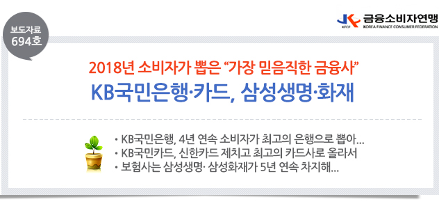 | 제목 | [보도자료 694호]2018 가장 믿음직한 금융사 국민은행·카드, 삼성생명·화재 | ||||